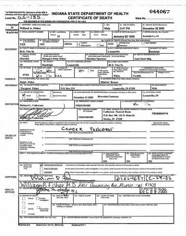 A lifelong resident of Randolph County, he was born on Jan. 2, 1930, the son of Ralph and Mildred Brewer Fisher. He was a graduate of Losantville High School and served with the U.S. Army.