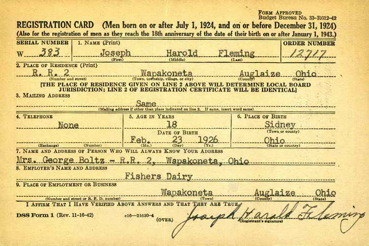 registered for the draft in Wapakoneta, OH on 12 February 1944 and was