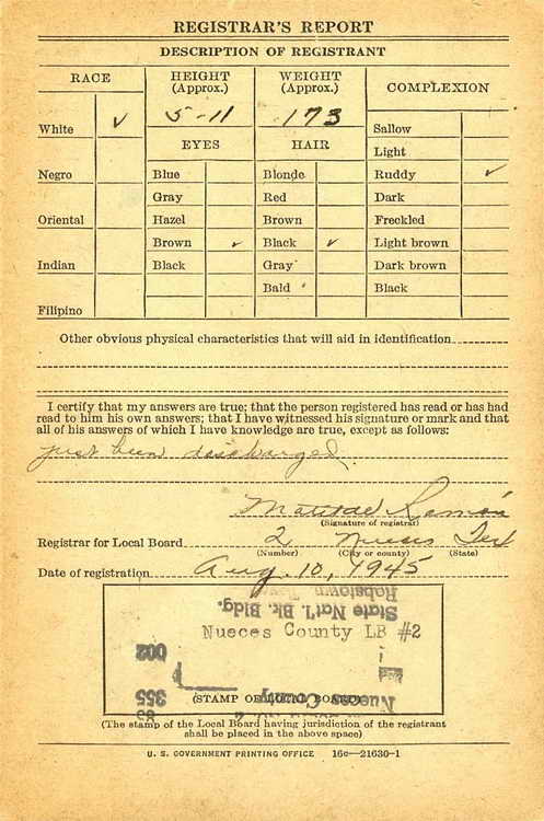 August 1945 in Nueces, TX. On 26 January 1945, he re-enlisted and returned