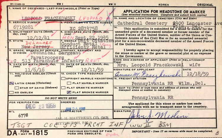On 13 August 1944 TSgt Fraczkowski was transferred from the 11th