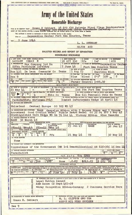discharged at Fort Sam Houston, TX on 7 June 1945.