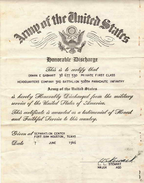 In 1944 Orman joined the Army and after training was assigned to the Parachute Infantry. During WWII he was with the 117th Airborne in Central Europe. He parachuted into enemy territory in Rhineland. Orman proudly served his country and among the decorations he earned were two bronze stars and a Purple Heart medal.