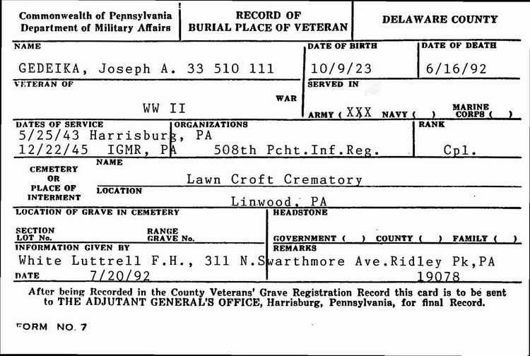 Harrisburg, PA on 25 May 1943 and was assigned to Hq Hq, 508th PIR.