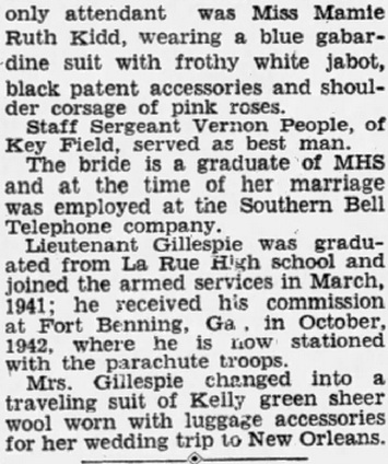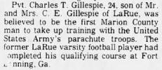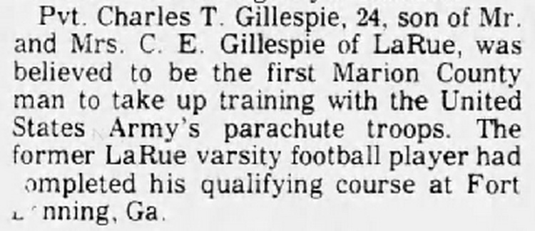 Pvt. Charles T. Gillespie, 24, son of Mr. and Mrs. C. E. Gillespie of La Rue, was believed to be the first Marion County man to take up training with the United States Army's parachute troops. The former LaRue varsity football player had