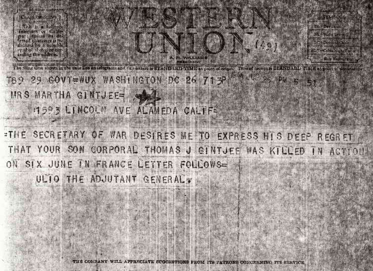 REGRETS THAT YOUR SON CORPORAL THOMAS T. GINTJEE WAS KILLED IN ACTION ON