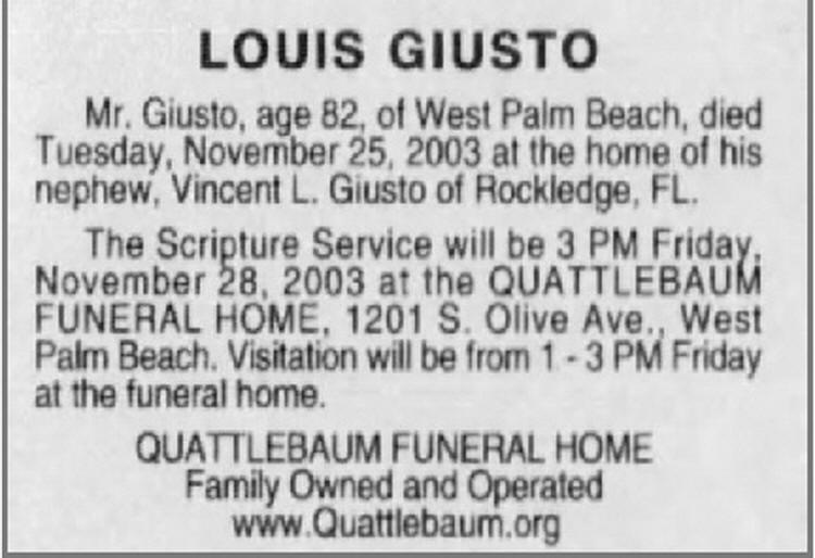 nephew, Vincent L. Giusto, of Rockledge, FL.