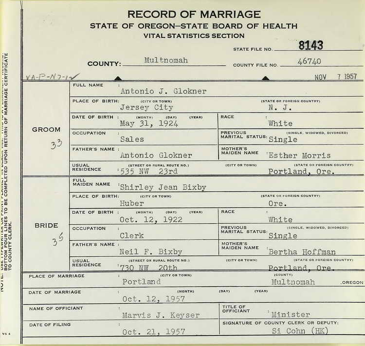 12 October 1957, Antonio, now a salesman, married Shirley Jean Bixby in