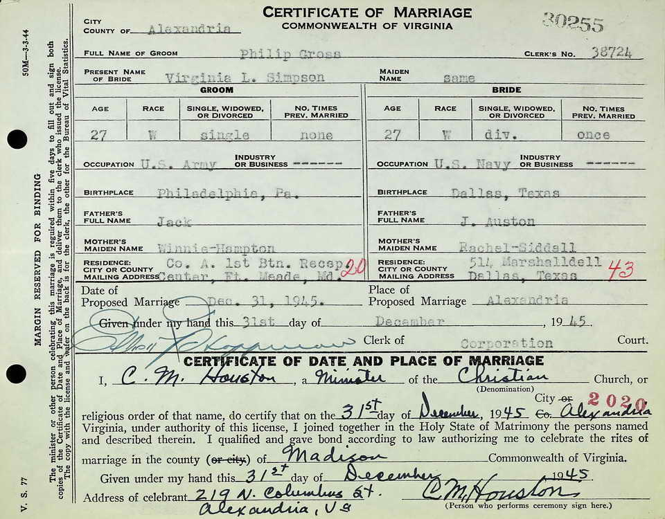 on 13 June 1945.and married Virginia L. Simpson in Madison, VA on 31