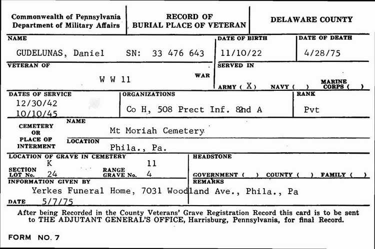 Daniel Gudelunas at Section K, Range 11, Lot 24, Grave 4 in the Mt Moriah Cemetery, Philadelphia (Philadelphia