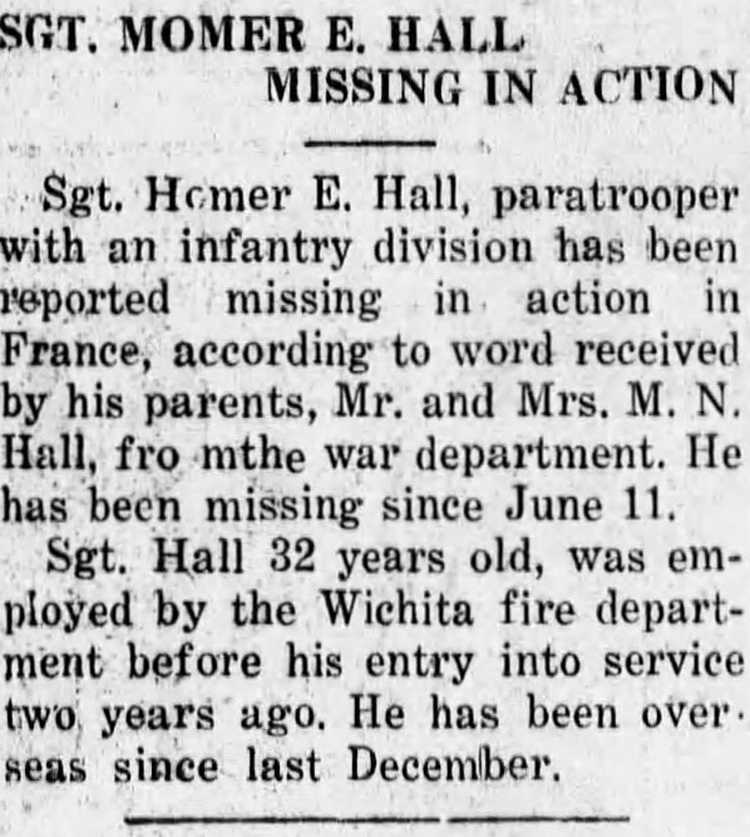 Sgt. Homer E. Hall, paratrooper with an infantry division has been reported missing in action in France, according to word received by his parents, Mr. and Mrs. M. N. Hall, from the war department. He has been missing since June 11. Sgt. Hall, 32 years old, was employed by the Wichita fire department before his entry into service two, years ago. He has been over seas since last December.