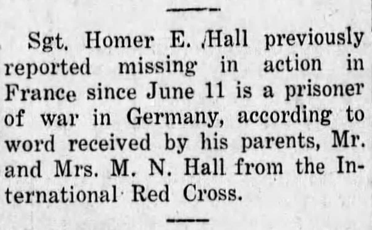 Sgt, Homer E. Hall previously reported missing in action in France since June 11 is a prisoner of war in Germany, according to word received by his parents, Mr. and Mrs. M. N. Hall from the International Red Cross.