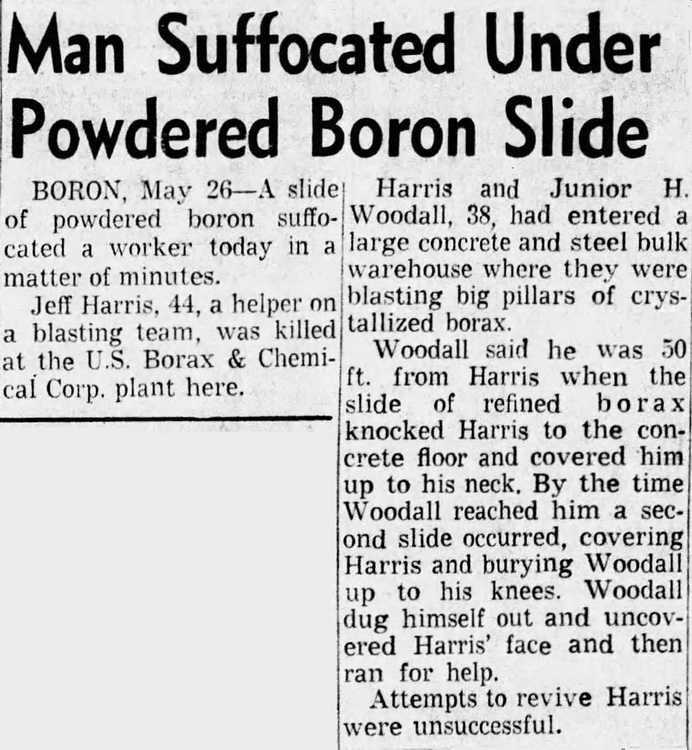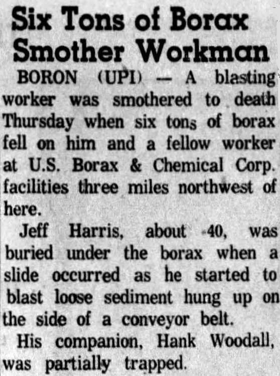 Jeff Harris, about -40, was buried under the borax when a slide occurred as he started to blast loose sediment hung up on the side of a conveyor belt. His companion, Hank Woodall, was partially trapped.