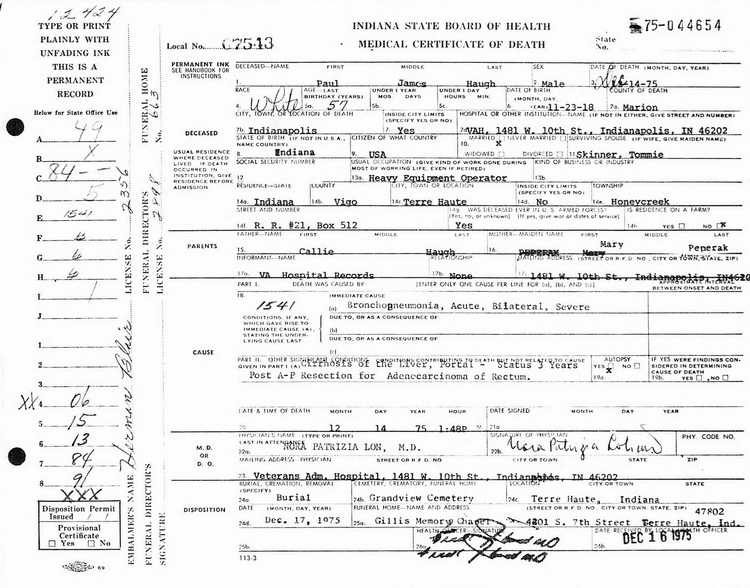 marker for Paul J. Haugh in Section 5, Lot 100, Grave 13, Grandview