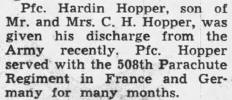 Mrs. C H Hopper was given his discharge from the Army recently.