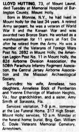 LLOYD HUTTING, 73, of Mount Laurel, died