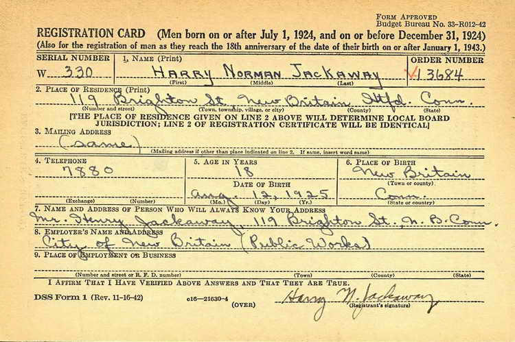 Draft record for Harry N. Jackaway ca 1943 in