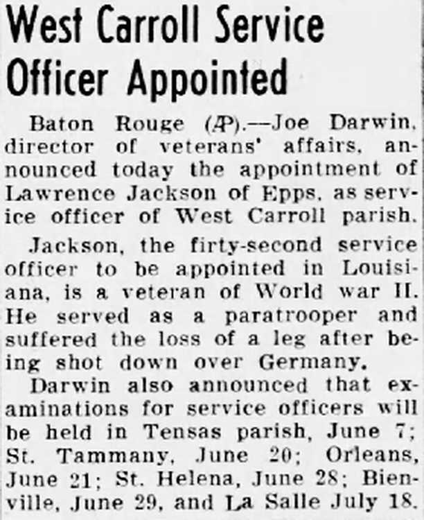 Mr. Jackson was a native of Epps and retired service officer with the Veteran's Administration in West Carroll parish. He was a veteran of World War II.