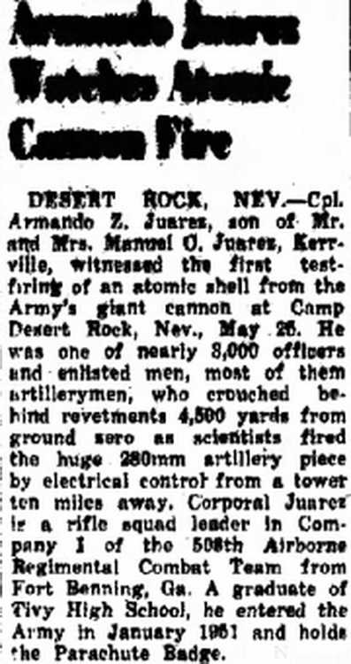 Manuel O. Juarez, Kerrville, witnessed the first test-firing of an atomic shell from the Army's giant cannon at Camp Desert Rock, Nev., May 25.