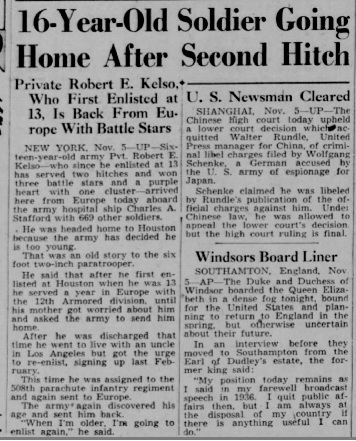 NEW YORK. Nov. 5 (UP)- Si\teen-year-old army Pvt Robert E. Kelso