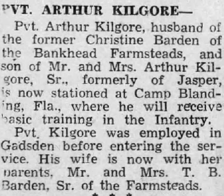 Fla., where he will receive basic training in the Infantry. Pvt. Kilgore was employed in Gadsden before entering the service. His wife is now with her