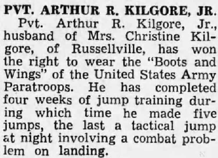 Pvt. Arthur R. Kilgore, Jr., husband of Mrs. Christine Kilgore, of Russellville, has won the right to wear the "Boots and Wings" of the United States Army Paratroops. He has completed four weeks of jump training during which time he made five jumps, the last a tactical jump at night involving a combat problem on landing.