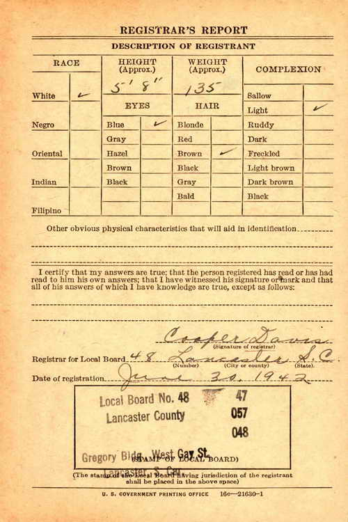 Lancaster, SC on 30 June 1942 and was inducted into