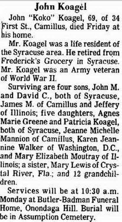 retired from Frederick's Grocery in Syracuse. Mr. Koagel was an