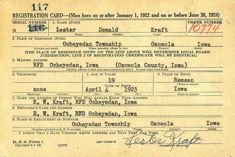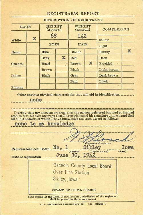 Sibley, IA on 30 June 1942 but was not inducted into the Army until 26