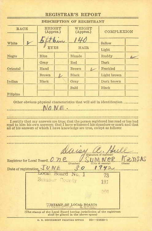 draft in Wellington, KS on 30 June 1942 and was inducted into the Army