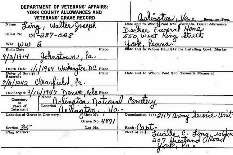 Veterans grave record and grave marker for Walter J. Ling in Section 35, Site