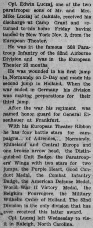 Mrs. Mike Luczaj of Oakdale received his discharge at Camp Grant and returned to his home Friday having landed in New York Nov 2 from the European Theater.