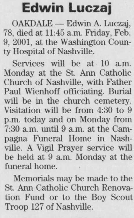 OAKDALE Edwin A Luczaj, 78, died at 11:45 am. Friday, Feb. 9, 2001, at the Washington County Hospital of Nashville.