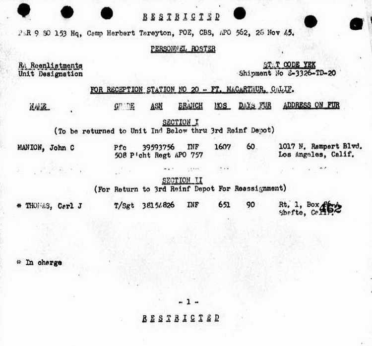 he is assigned to Reception Station 20, Fort McArthur which was in San