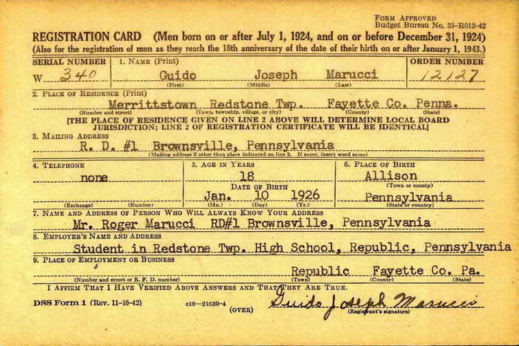registered with Draft Board 4 in New Salem, PA ca. 1944 while still a