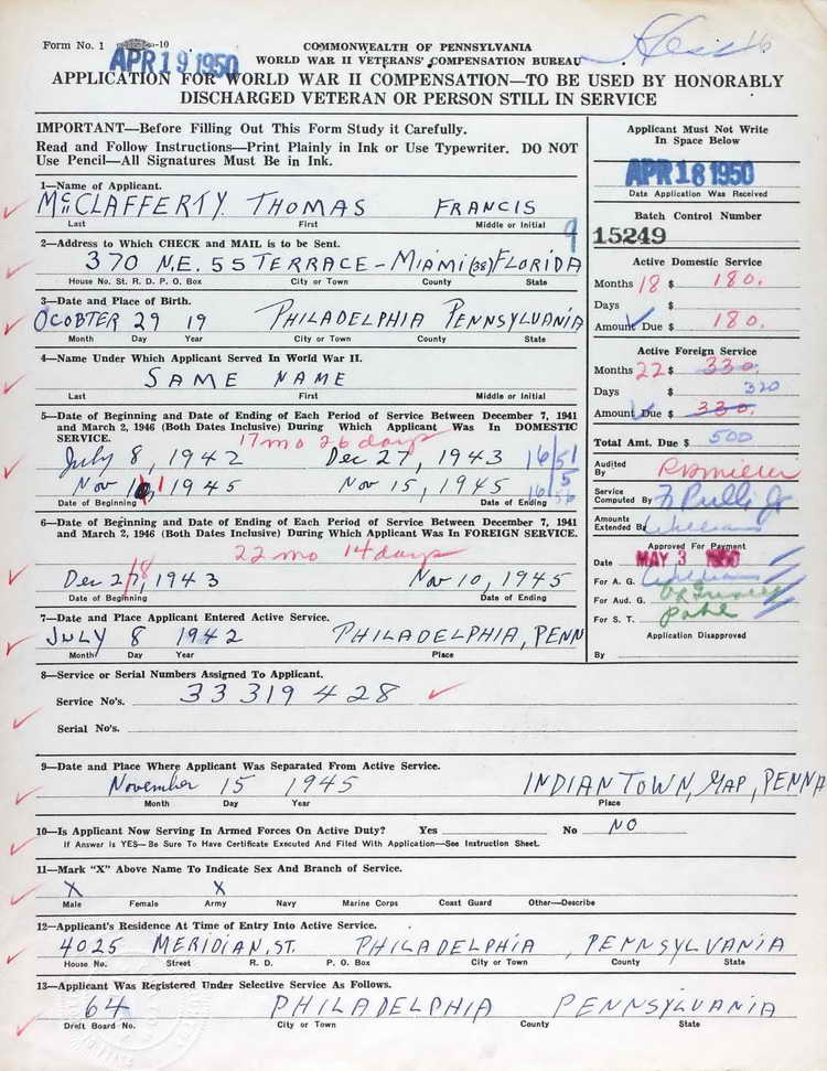Pennsylvania WWII Veterans Bonus Application submitted by