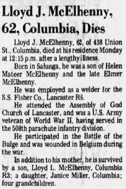 In addition to his mother, he is survived by a son, Lloyd L. McElhenny, Columbia R3; a daughter, Janice Miller, Columbia; four grandchildren.