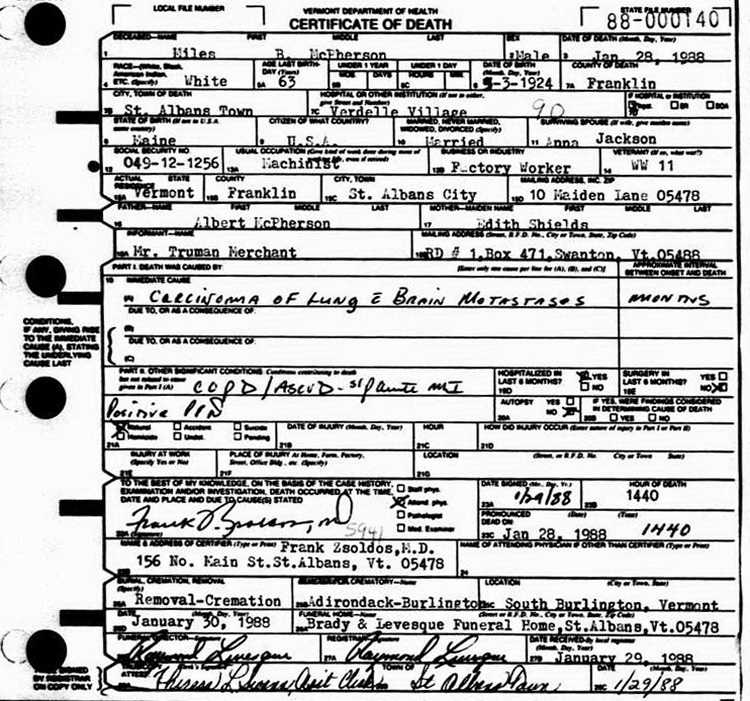 documents his death on 28 January 1988 in St. Albans, VT. He