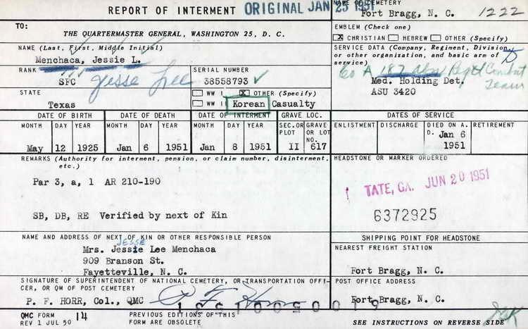 grave marker for Jesse L. Menchaca in Row 17, Grave 617 of the Fort