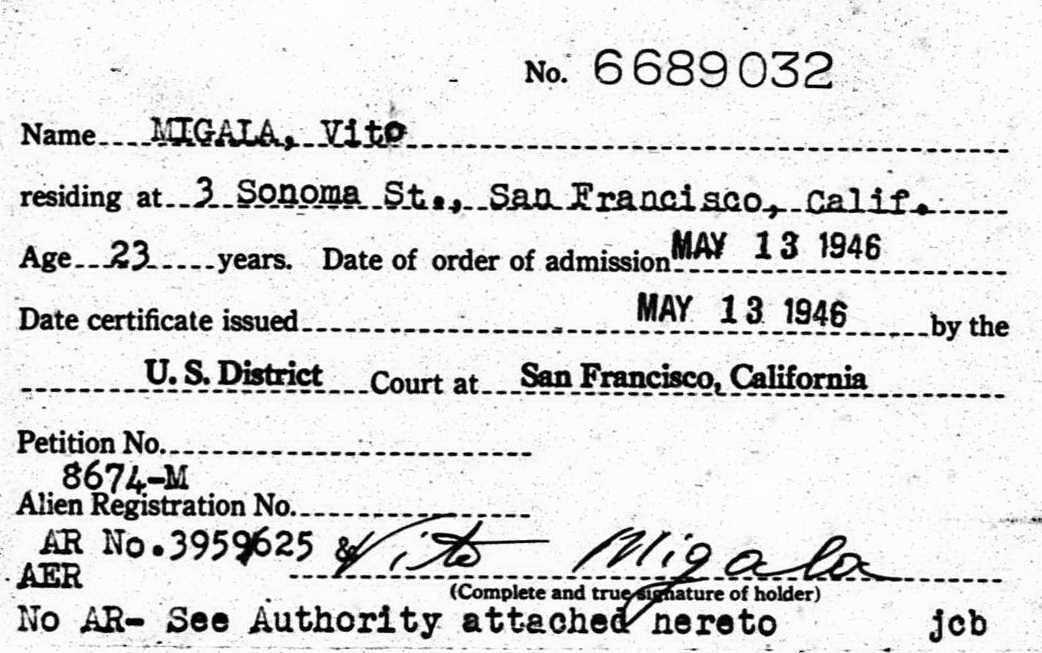 Calabria, Italy, became a naturalized U.S. citizen on 13 May 1946.
