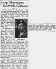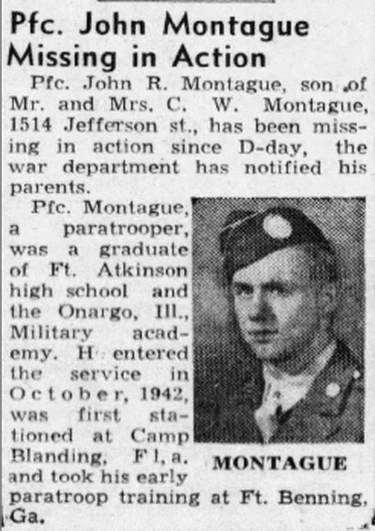 A graduate of the military academy at Onaigo, IL.. Corp. Montague entered service in 1942. He was a member of the 508th paratroop regiment and was taken prisoner in Normandy on D-Day, being released May 8, 1945. Only 918 men out of the 2,056 who jumped over Normandy were returned to their base in England.