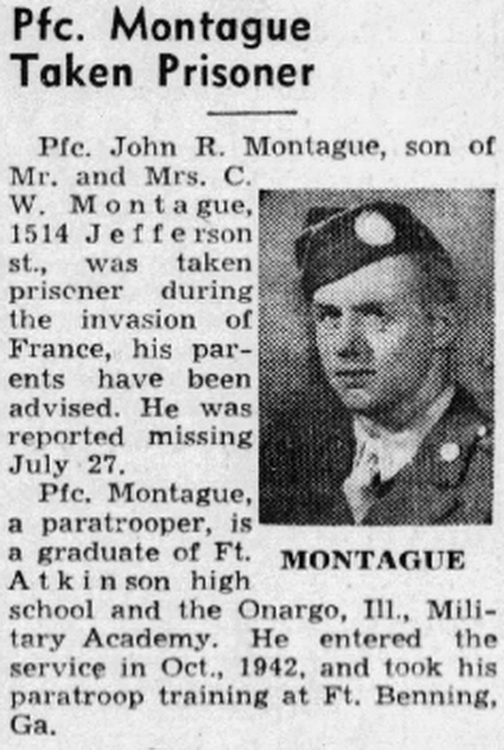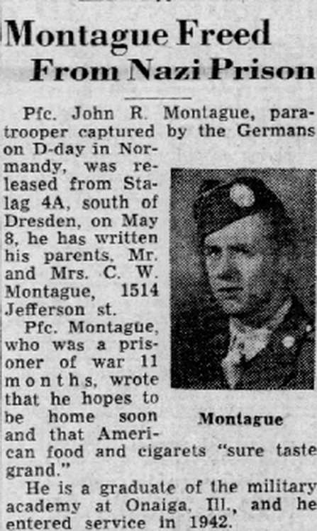 Pfc. John R. Montague, paratrooper captured by the Germans on D-day in Normandy, was released from Stalag 4A, south of Dresden, on May 8, he has written his parents, Mr. and Mrs. C. W. Montague, 1514 Jefferson st.