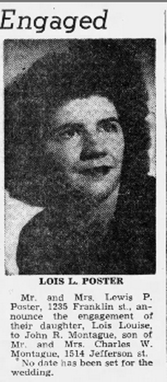 Mr. and Mrs. Lewis P. Poster, 1235 Franklin st., announce the engagement of their daughter, Lois Louise, to John R. Montague, son of Mr. and Mrs. Charles W. Montague, 1514 Jefferson st.