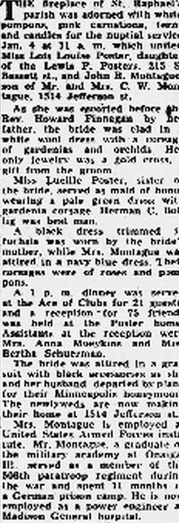 ferns and candles for the nuptial service Jan. 4 at 11 a. m. which united Miss Lois Louise Poster, daughter of the Lewis P. Posters, 215 S. Bassett st., and John R. Montague, son of Mr. and Mrs. C. W. Montague, 1514 Jefferson st.
