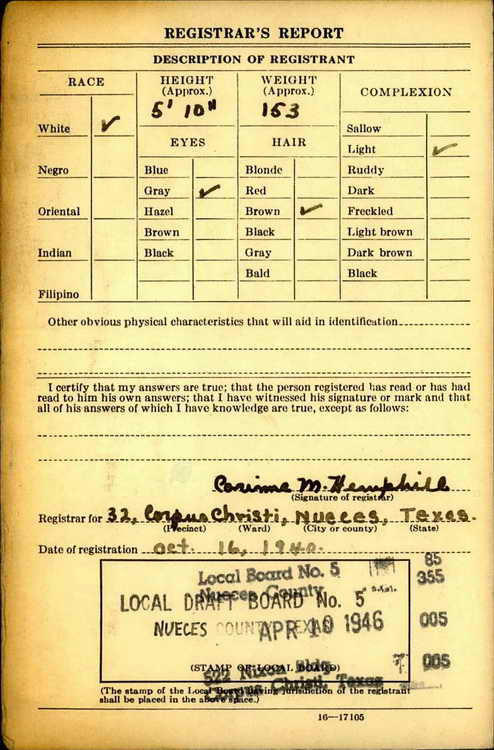 the draft in Corpus Christi, TX on 16 October 1940 and was inducted into