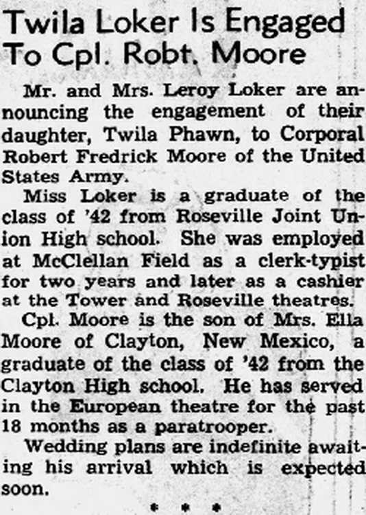 Twila Phawn, to Corporal Robert Fredrick Moore of the United States Army.
