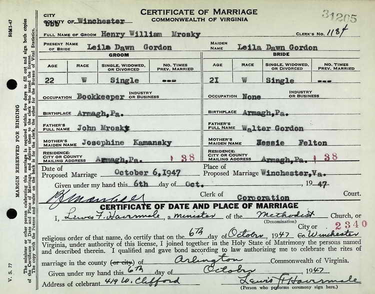 Using his newly adopted surname variant of Mrosky, Henry married