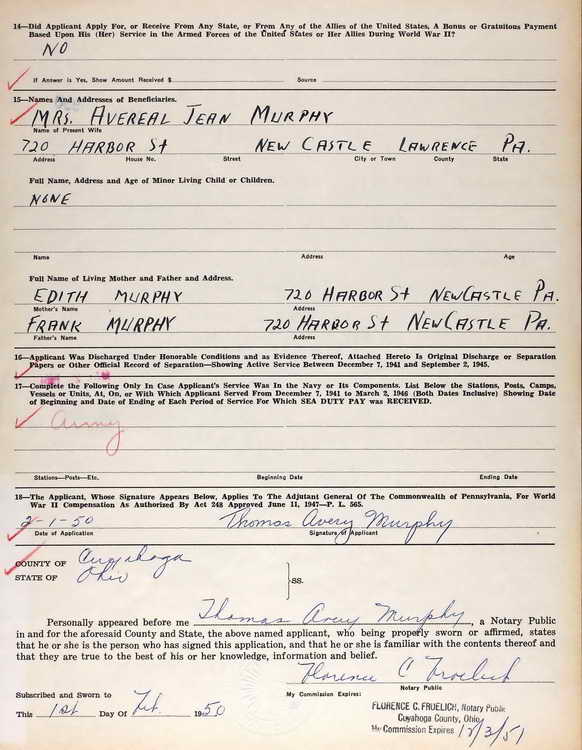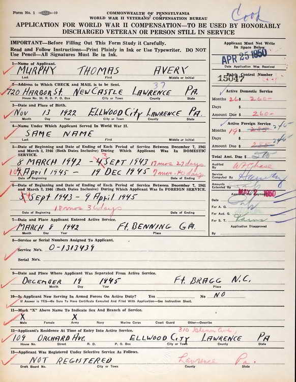 Pennsylvania WWII Veterans Bonus application for Thomas A.