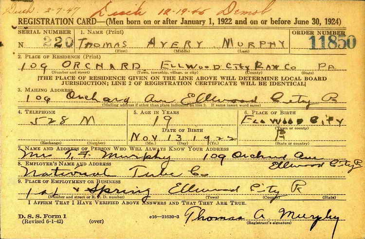 Thomas A. Murphy registered for the draft ca. 1941. He
