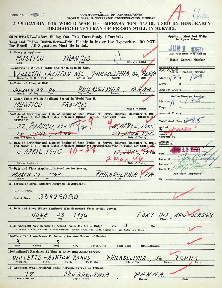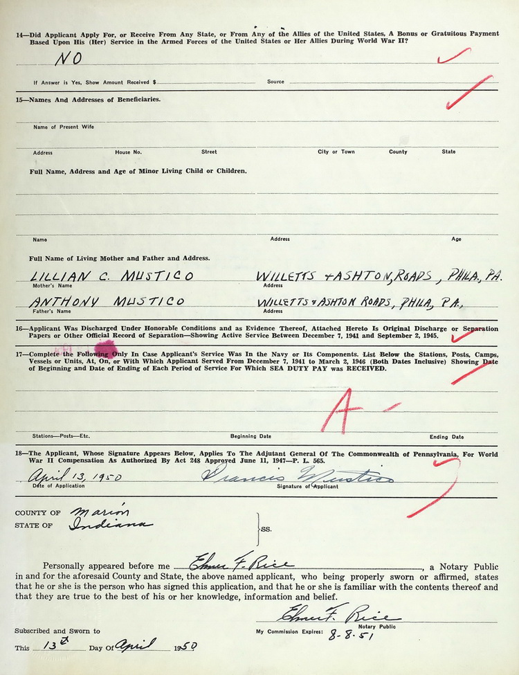 this application for the Pennsylvania WWII Veterans Bonus. He was
