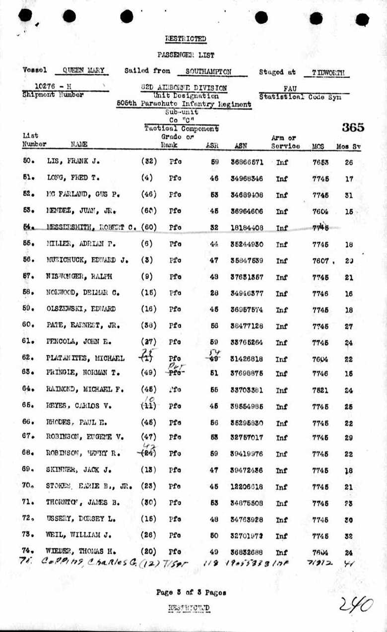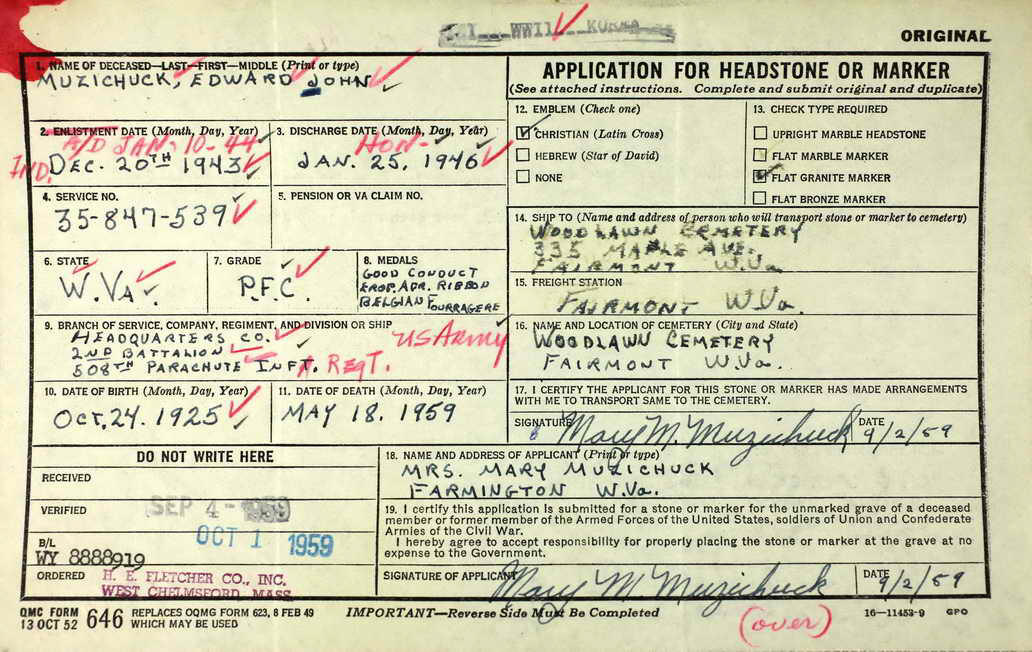 1944 Pvt Muzichuck was transferred from the 82nd Airborne Division HQ to